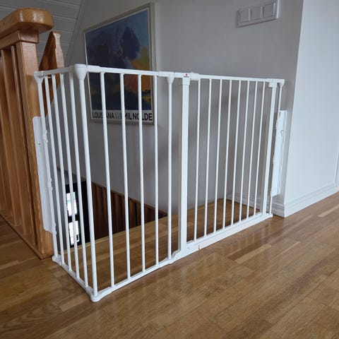 BabyDan Barnsäkerhetsgrind i vit färg. Köptes ny av oss på Jollyroom. Knappt använd.