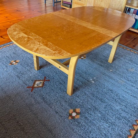 Ellipsformat soffbord i masurbjörk. Benen monteras enkelt med hjälp av skruvar.