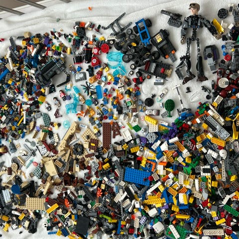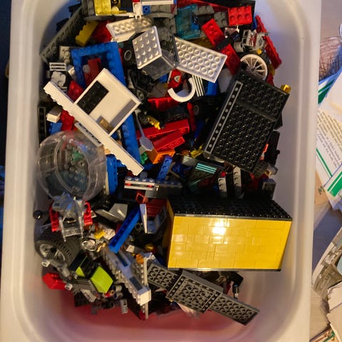 Lego, det mesta färgsorterat i lådor säljes. Olika kategorier, tex City (bla en brandstation), Star wars, Harry Potter (bla en hel borg), Technic, Ninjago och Super Mario. Ett 20-tal ritningar.