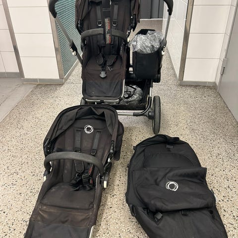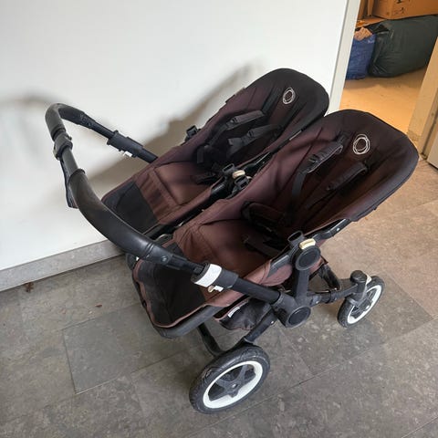 Bugaboo dubbelvagn barnvagn med grå klädsel i sittdelar och ljusblå slufetter. Vagnen är utformad för två barn och har separata sittplatser med säkerhetsbälte. Vagnen har använts flitigt till promenader i byn. Däck behöver bytas. Bromspedalen behöver också bytas. Använts till två barn, två år mellan barnen.