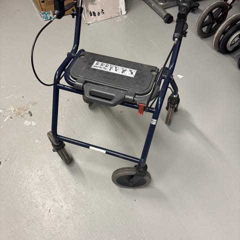 Rollator med svart ram och sittplatta. Utrustad med fyra hjul och handtag med bromsar. Används som hjälpmedel för ökad rörlighet och stöd vid gång.