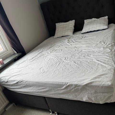 IKEA säng med tillhörande madrass och bäddmadrass. Sängen har grått tyg och träben. Passar för sovrum och erbjuder en standardstorlek för enkel användning.perfect för barn och vuxen, jätte skön säng