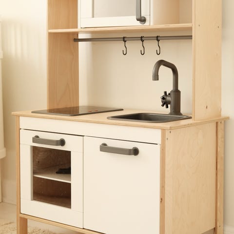 IKEA Duktig lekkök i trä med spis, vask och skåp. Setet inkluderar flera leksakstillbehör som mat, köksredskap och serveringsartiklar i olika färger och material. Mycket av det är i trä