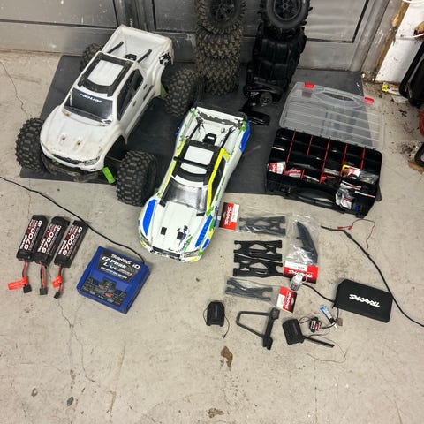 Traxxas TRX-4 radiostyrd bil med fyrhjulsdrift (4WD) i färgerna röd och svart. Levereras med extra hjul, batteripaket och laddare. Bilen har robust konstruktion och är avsedd för terrängkörning.