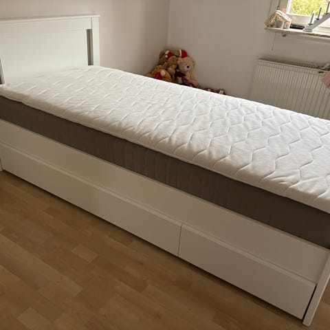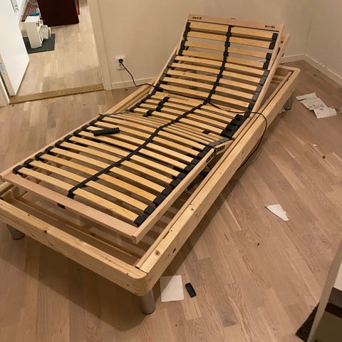 Jysk hopfällbar säng med madrass i blå färg. Sängen har en ram av metall och trälameller som stödjer madrassen. Den är utformad för enkel förvaring och transport genom att kunna fällas ihop.