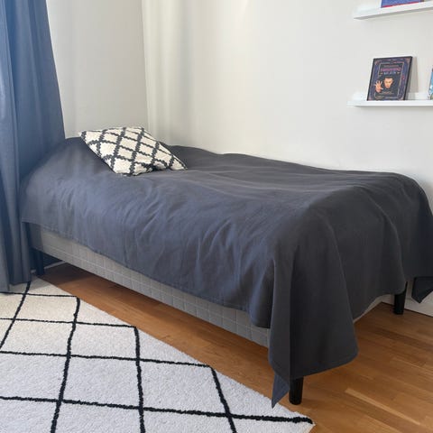 IKEA SKOTTERUD säng med madrass mörkgrått tyg. Sängen har träben och en madrass med vitt överdrag. Passar som enkelsäng eller gästsäng. Köpt 2024.