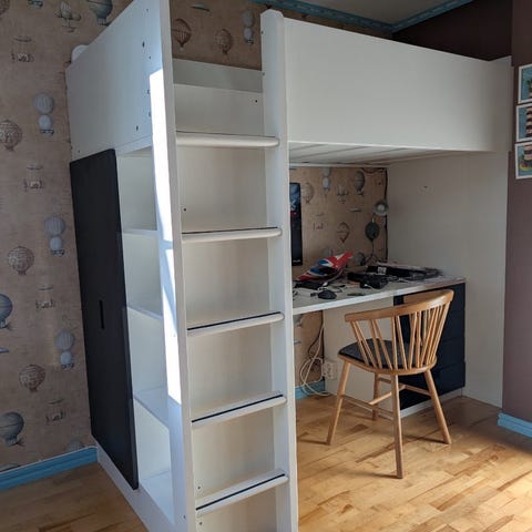 IKEA Loftsäng Mydal målad i ljusgrå men ribborna i övre sängen är blandade blå och grå på undersidan. Sängen är utformad för barn och har en loftdesign som frigör utrymme under sängen.