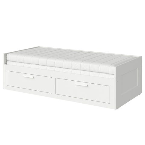 Brimnes utdragbar dagbädd med förvaring från IKEA (inkl. 2 st Sultanmadrasser från IKEA). Sängen är 205 cm lång, 57 cm hög, 86 alt. 160 cm bred. Har använts som gästsäng och är i mycket bra skick. Handtagen på förvaringslådorna är målade svarta.
