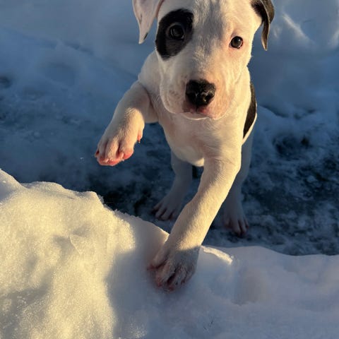Bella är en blandras av amstaff, corso cane, american bully och boxer. Hon är väldigt lugn, älskar andra djur, människor och barn och är väldigt försiktig med yngre barn.