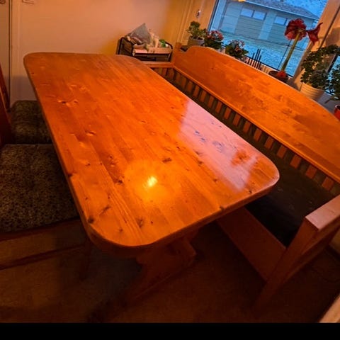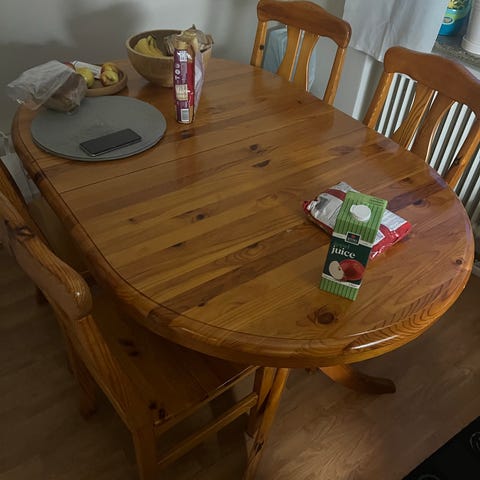 Väl använt, men för den händige kan bord o stolar slipas om o lackas. Enstaka hack men inte djupare än att det kan fixas till.