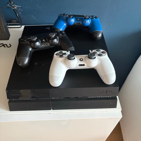 Playstation 4 spelkonsol inklusive två svarta handkontroller. Konsolen är avsedd för spel och multimediaanvändning.