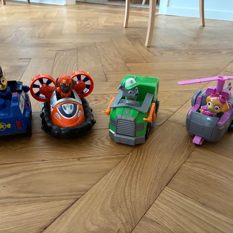 Paw Patrol fordonsleksaker och figurer i blå färg. Setet inkluderar flera fordon och figurer från serien, avsedda för barnlek. Den stora bilen för Chase går att öppna pch ha en massa inredning.