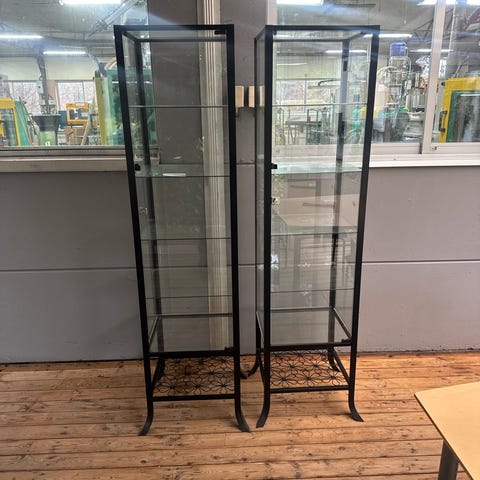 Fina vitrinskåp ca H 110, B 80, D 40 cm. På bilden ställda ovanpå varandra pga förvaring.