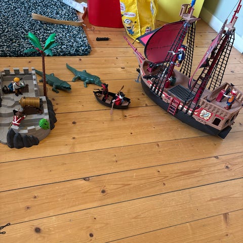 Setet inkluderar ett piratskepp med kanoner, en borg med torn och en samling figurer i olika utstyrslar. Lösa detaljer som till exempel gevär, åror och hattar medföljer köpet.