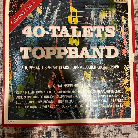 En samling av sex vinylskivor med olika artister och musikstilar. Skivorna inkluderar album från Louis Armstrong, Glenn Miller och andra, med varierande omslagsdesign och musikgenrer.