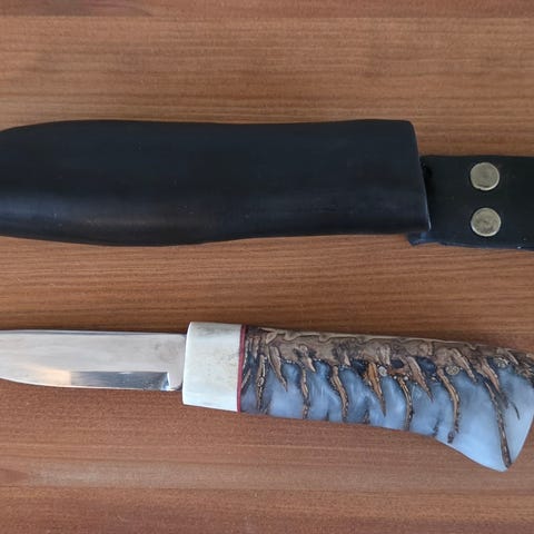 En kniv med frontholk i mässing, mellanlägg av björknäver och trä i ek. Rostfritt blad och läder från Tärnsjö garveri