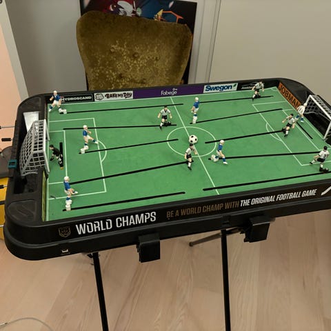 Fotbollsspel i trä med spelare i blått och vitt, utrustat med poängräknare. Passar för inomhusbruk. Storlek 128x62cm