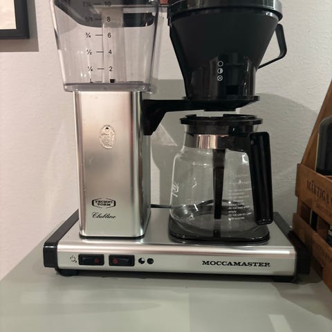 Moccamaster kaffebryggare i silver. Utrustad med glaskanna och vattenbehållare med mätmarkeringar. Designad för att brygga kaffe med jämn temperatur och optimal extraktion.