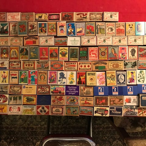 Gammalt tändsticksplån från England. När man öppnar ska tändstickan i mitten ställa sig upp. Dock har gummit torkat men kanske den påhittige kan fixa det.