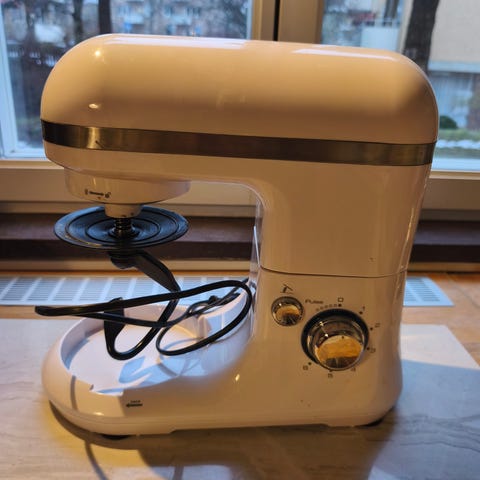 OBH Nordica köksmaskin med flera tillbehör inklusive vispar och degkrok. Maskinen har en vit och transparent design och är lämplig för olika matlagnings- och bakningsuppgifter.