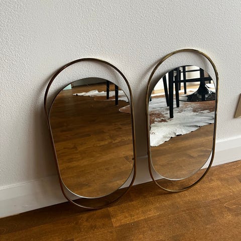 H&M Home rund spegel med ram i rotting. Spegeln har ett handtag av rotting för upphängning och en naturlig beige färg.