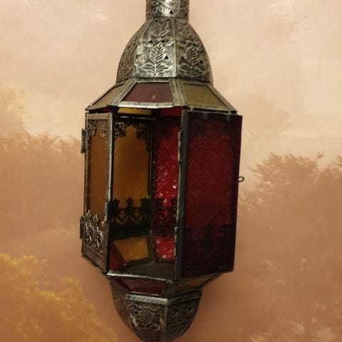 Amberfärgat glas med vacker form som lyser med varmvitt sken. Lampan är dimmerkompatibel och har E27-sockel.