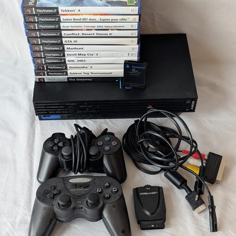 Playstation 2 spelkonsol med tre handkontroller, laddare, ratt, eye toy, Buzz handkontrollers, mikrofon.