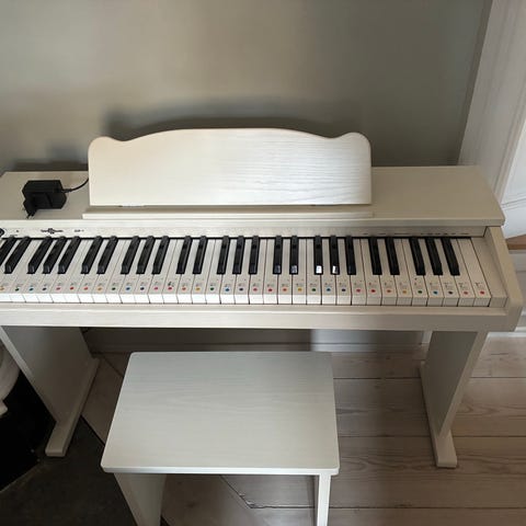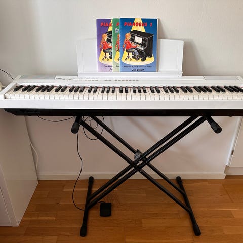 - Högkvalitativt digitalt piano med stativ, hörlurar och pall.
