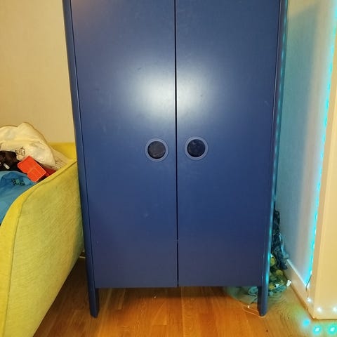 Möbeln har tidigare varit monterad under en våningssäng, vilket innebär att det finns märken efter skruvar på sina ställen. Den är dock i ett fullt fungerande och stabilt skick för dig som söker prisvärd och smart förvaring.