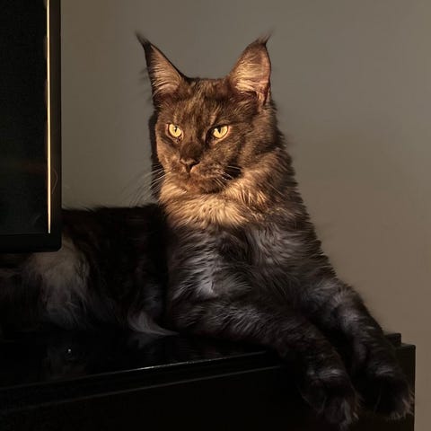 Här har vi finaste fröken i stan. Resultatet av en tjuvparning. Pappa är renrasig Maine coon, så hon blir en halvstor ståtlig fröken.