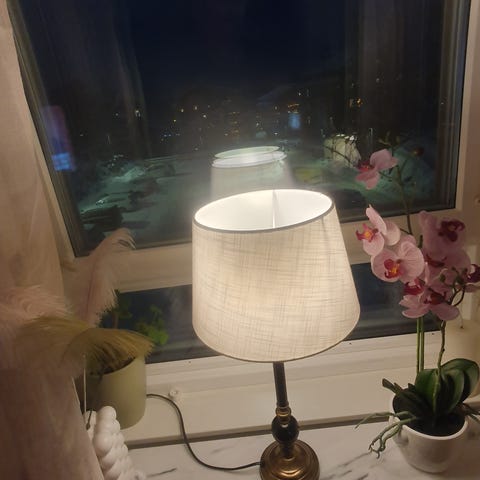 Bordslampa i mässing med vit skärm, ca 42 cm hög
