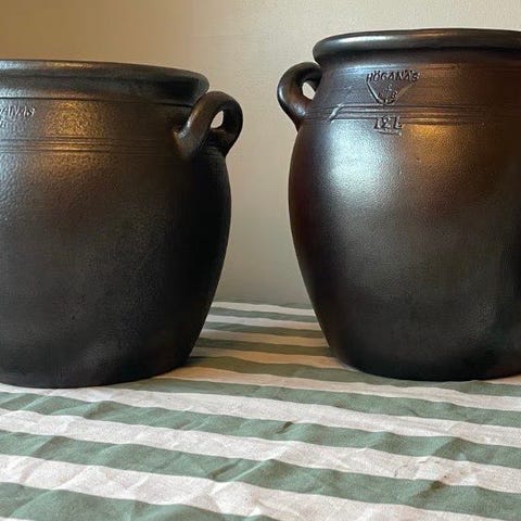 Höganäs kruka i keramik med brun färg och lock. Krukan har en rund form och en texturerad yta. Märkt med Höganäs 1 L under botten.