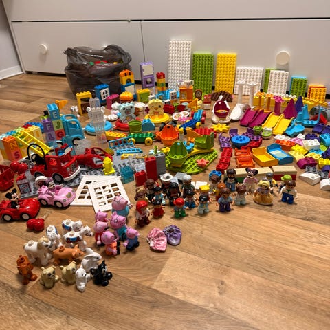 Barnen säljer sitt Duplo! Blandat med bland annat många vanliga klossar, olika bilar, flygplan, helikopter, flera tåg med räls. Ett gäng olika gubbar och djur. Två stora gröna basplattor och flera mindre. Ett gäng olika specialbitar.