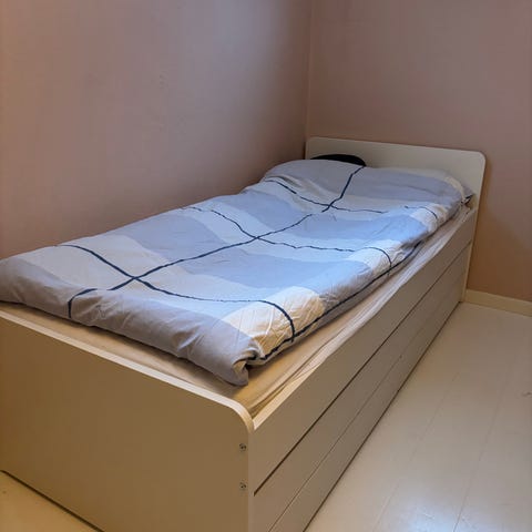 Sängen köpt på IKEA för runt 3000 kr och madrasserna för ca 6-700 kr styck. Stödbrädorna gick på ca 200 kr st. Totalt ca 4600 kr.