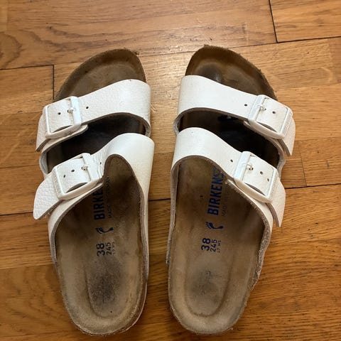 Birkenstock Boston vita stl 38, smal läst. Synligt använda, men fungerar fint. Skrynkliga i lädret på bilden, men de är fina och bra, om än slitna.