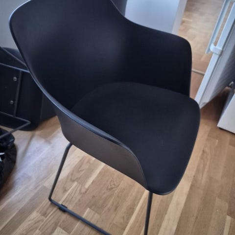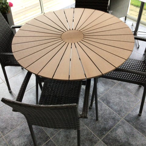 Bordsskivan är i mycket tåligt träliknande grått material och de fyra stolarna i svart konstrotting