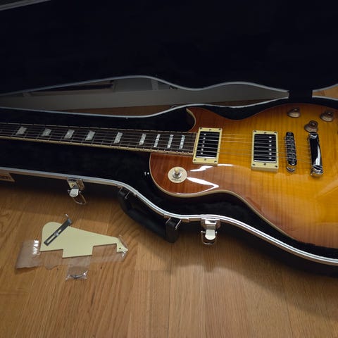 Vintage v100 gloss black i Les Paul stil. Gitarren är använd flitigt men den är i bra skick och funkar utmärkt att spela på. Det enda är att metallbiten på plektrumskyddet är borta (referens på bild 6) dock är det inget som påverkar spelandet alls. Jag har nyligen bytt strängar på gitarren. Nypris är runt 6000 och jag säljer den för 3500 men priset är förhandlingsbart. Finns i Malmö på Värnhem och kan provspelas. Jag skulle även kunna tänka mig att byta gitarren mot exempelvis en Fender squier Telecaster eller Stratocaster.