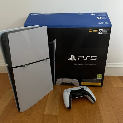 Sony Playstation 5 spelkonsol med avancerad grafik och snabb laddning. Konsolen har en modern design i vitt och svart, och är kompatibel med ett brett utbud av spel. Passar för användning med TV och erbjuder stöd för högupplöst spelupplevelse.