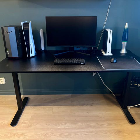 IKEA skrivbord i vitt med metallben. Bordet är rektangulärt och har en slät yta. Passar för kontors- eller arbetsrumsmiljöer. Benen är höj och sänkbara