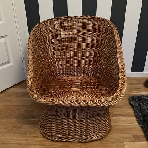 Fin vit korgfåtölj med beige rygg- och sittdyna