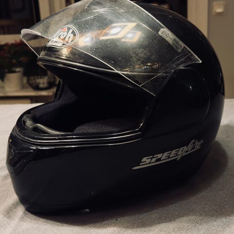 En scorpionhjälm, endast använd fåtal gånger och då till moppe. Aldrig tappad eller liknande.