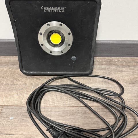 Arbetsbelysning med justerbart stativ och två lampor. Lamporna är monterade på ett gult stativ med tre ben för stabilitet. Passar för belysning vid bygg- och reparationsarbete eller andra aktiviteter som kräver starkt ljus.