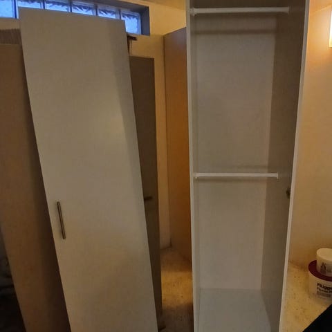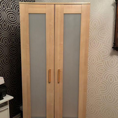 IKEA garderober med flera hyllplan och lådor. Möbeln är vit och designad för förvaring av kläder och andra föremål.