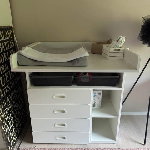 Säljer ett skötbord från ikea med skötbädd också från ikea, man får med 3 st lådor till förvaring och även två lådor du kan hänga på skötbordet med förvaring!