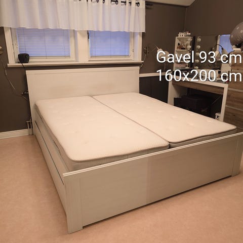 Benet på ena sängen sitter löst (skruven får jag inte av) men medföljer 8 stycken silver metallben samt två svarta hakar till sänggaveln. Den har mycket mer att ge men köpt en större.