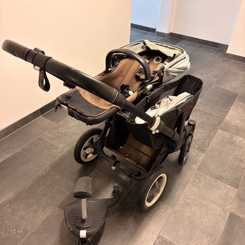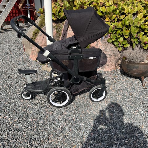 Välskött Donkey med mycket tillbehör. Stället från 2015,. Två klädslar, grå klädsel från 2020 samt svart från 2015. Solparasoll och två helt nya suffletter i svart. Regnskydd samt sommar sufflett med nät.