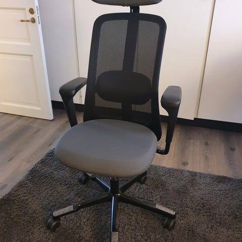 Blå kontorsstol med armstöd och hjul. Stolen har en hög rygg och är anpassad för kontorsbruk. Den är justerbar i höjd och har en stabil bas med fem hjul för enkel förflyttning. Hörnbord 200x195cm allt för 600,-