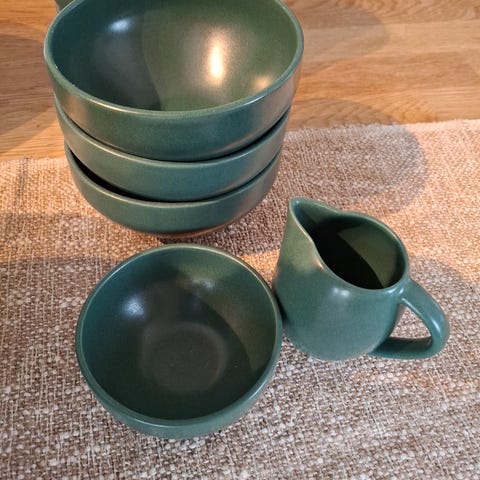 11 st stora mattallrikar och 9 st. Soppskålar i samma fina färg stengods från Höganäs Hämtas i Stockholm centralt läge när buss och T-bana