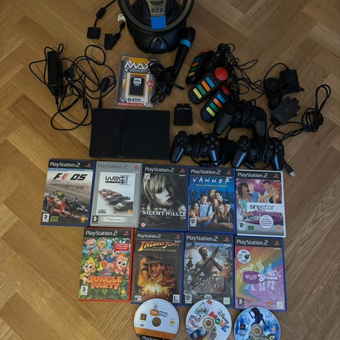 Playstation 2 med spel, minne och kontroller