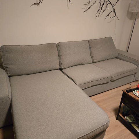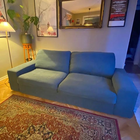 Fin, grå 2-sitssoffa i modell Kivik från IKEA! Den har ca 3 år på nacken. Finns en del fläckar, men klädseln är avtagbar så med lite kärlek från tvättmaskinen är den som ny!